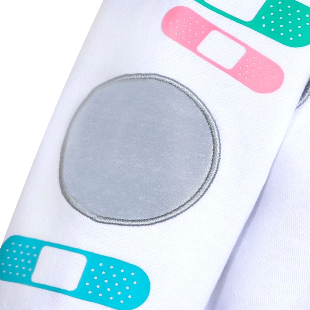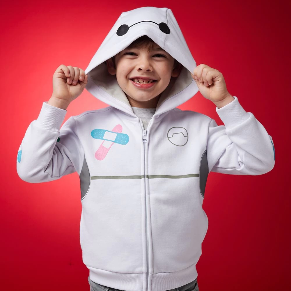 The inflatable personal healthcare companion from Disney’s Big Hero 6 brings his oversize personality to this jacket. Baymax’s distinctive eyes peer out from the hood of this cotton blended top that includes his markings on elbows and side. Colorful band aids make this a hoodie that really sticks out.
