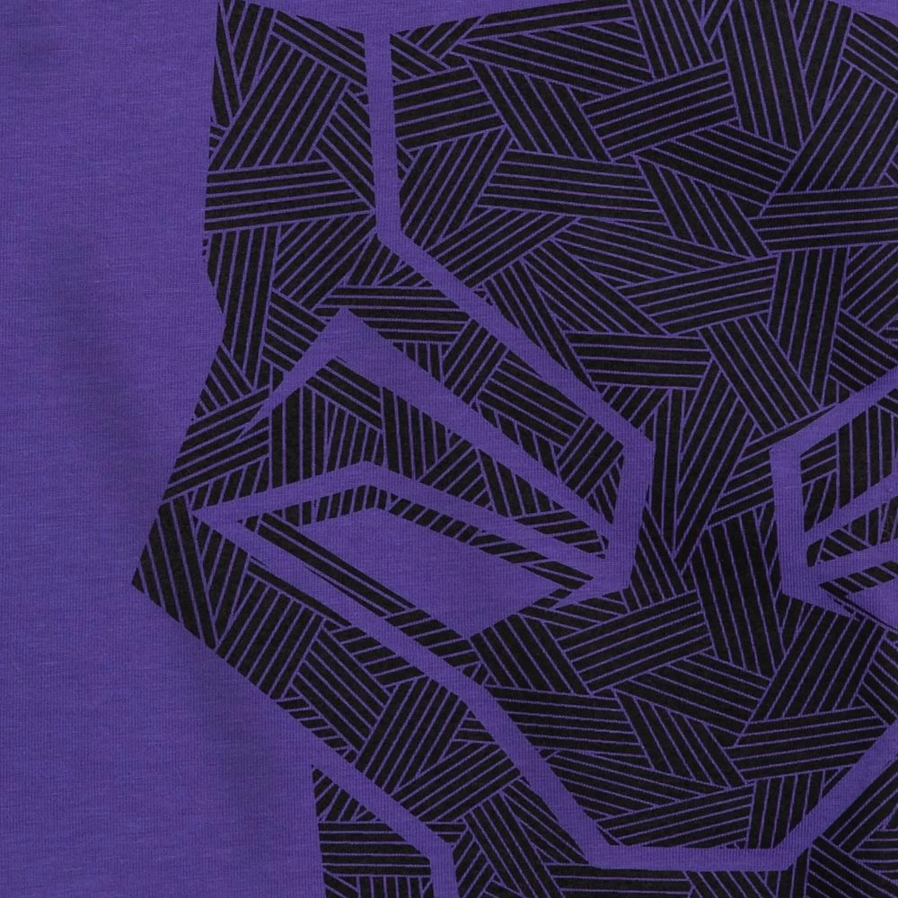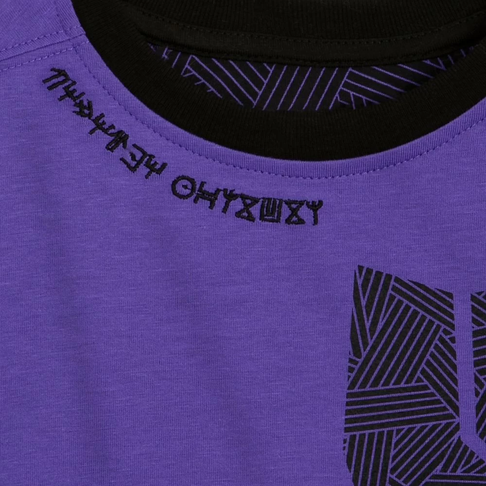 They will stand tall like their heroes in this Black Panther: Wakanda Forever t-shirt emblazoned with the iconic Black Panther symbol and embroidered with ”Wakanda Forever” written in the Wakandan alphabet. Black contrast trim and geometric details on the inside collar make this royal purple tee so very stylish. Just like your young hero.