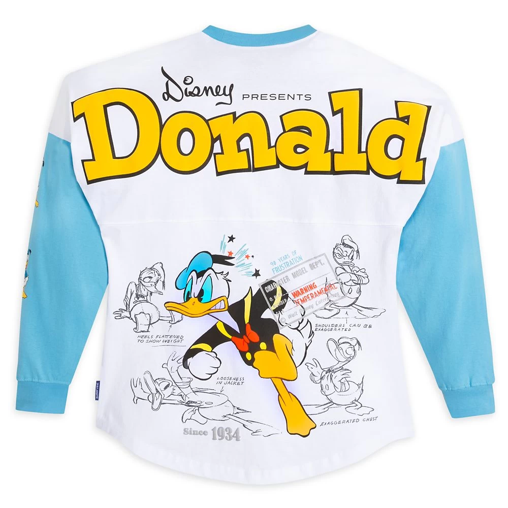 Celebrate 90 years of frustration and ruffled feathers in this commemorative Spirit Jersey honoring longtime cartoon favorite Donald Duck on his nine decade anniversary. Puffy accents and vintage Disney Studios art display Donald through the years on front, back and sleeve.