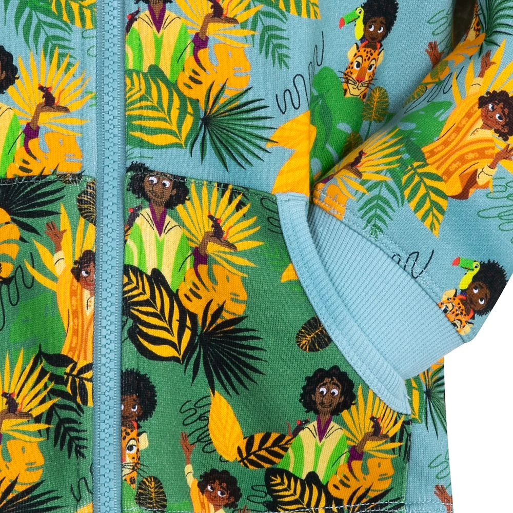 It’s kinda hard not to talk about Bruno when you see this bold zip jacket inspired by Disney’s Encanto! The unmentionable member of the Madrigal family is pictured with his young nephew, Antonio, in the colorful allover print of this hooded coat that’s perfect whether you’re heading to the Madrigal’s mountain home in Colombia, or a little closer to home.