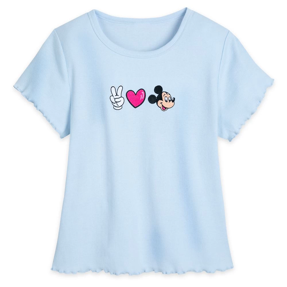 Peace, love and Mickey Mouse are aspirational ideals we can all appreciate. Display the icons as embroidered appliqués on this ribbed tee with trendy touches like boxy fit, scoop neckline and lettuce hems. Get ready to change the world with Mickey!