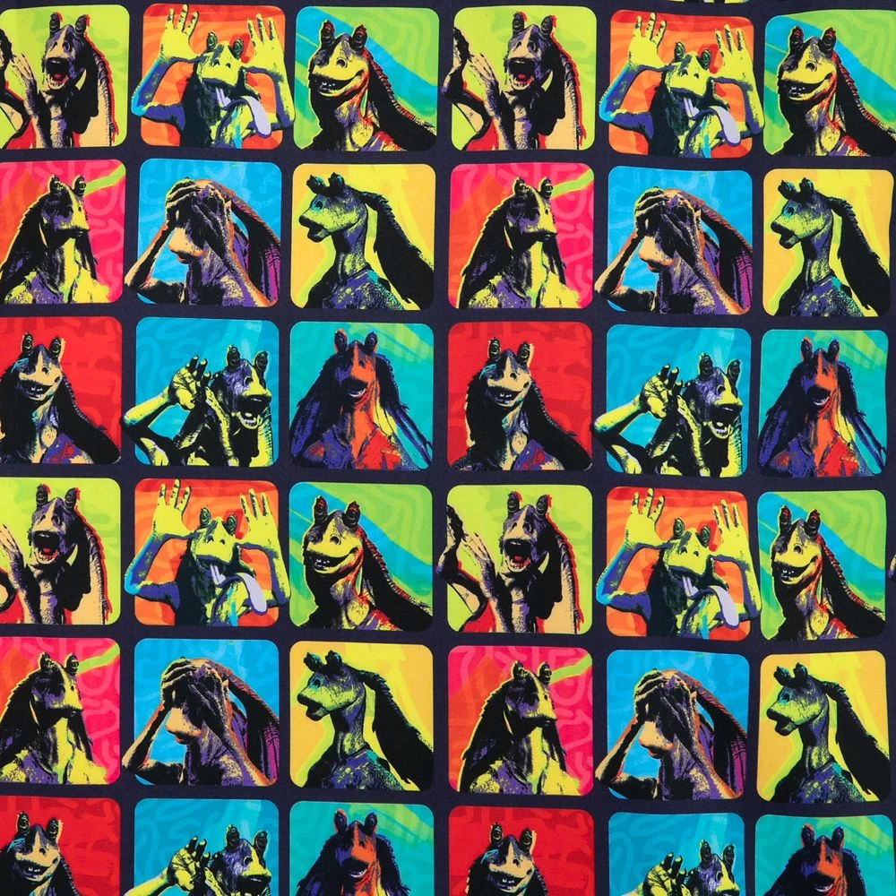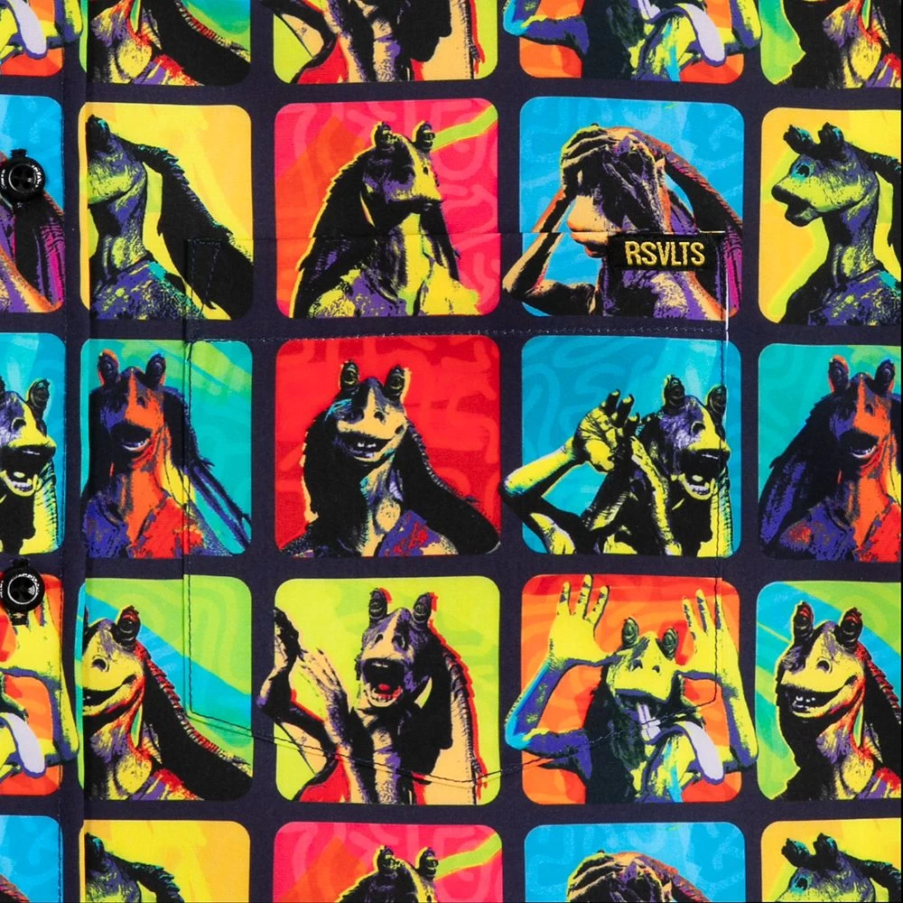 One of the most controversial Star Wars characters, Jar Jar Binks is celebrated in pop art style in the allover print on this shirt by RSVLTS. Made with their signature KUNUFLEXâ„¢ four-way stretch fabric, it features a colorful screen art design of Jar Jar who first appeared in Episode 1: The Phantom Menace. This striking shirt, which features classic details like a full button front, button collar and shirttail hem, will inspire cries of ”Ooh, mooey mooey, I love you!”