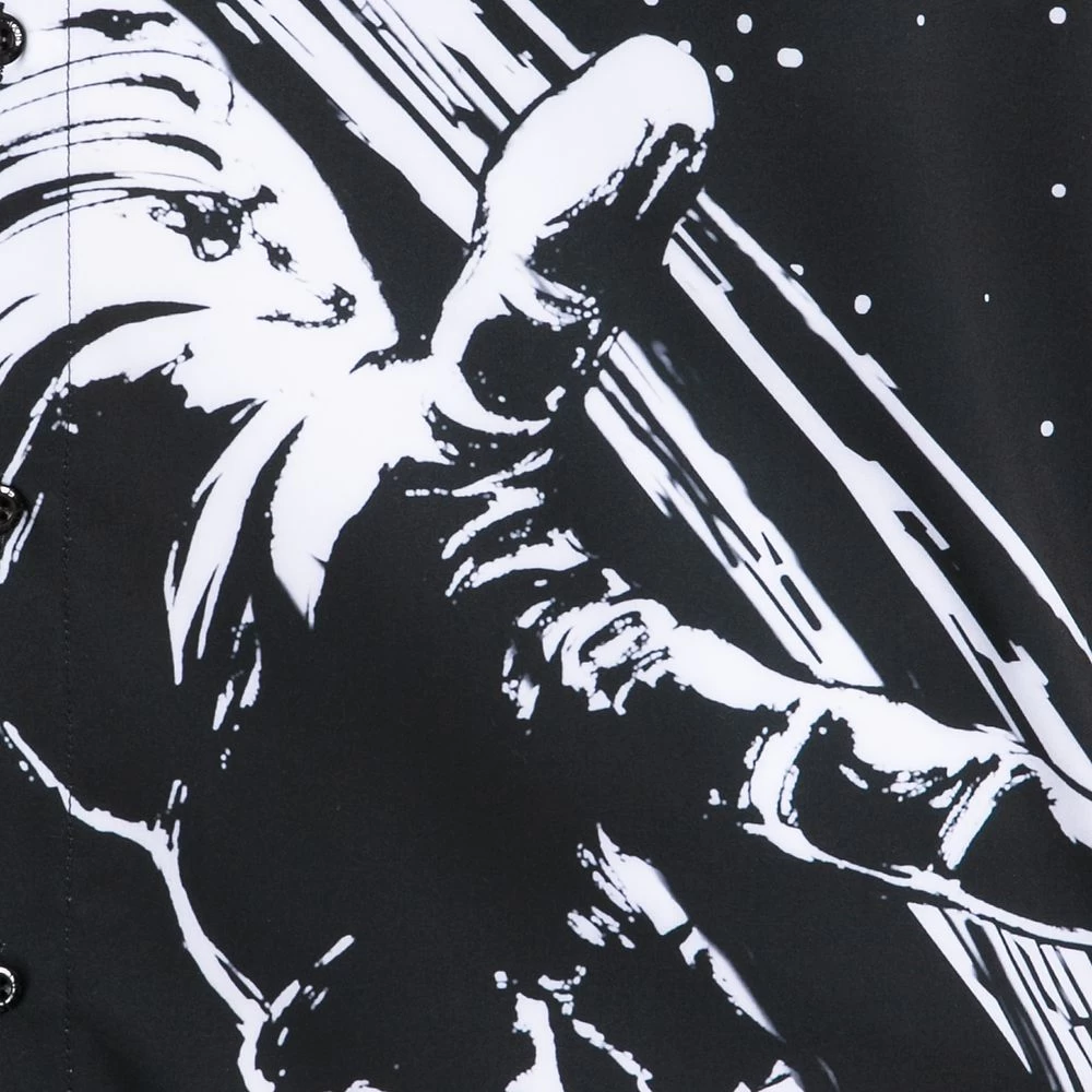 Darth Vader stretches out a hand as he embodies the ”Power of the Dark Side” on this Star Wars shirt by RSVLTS. Made with their signature KUNUFLEXâ„¢ four-way stretch fabric, it features a dramatic black and white design with the Dark Lord of the Sith against a starfield background. This striking shirt also features the Star Wars logo and classic details like a full button front, button collar and shirttail hem. Put it on and you’ll be a Force to reckon with.