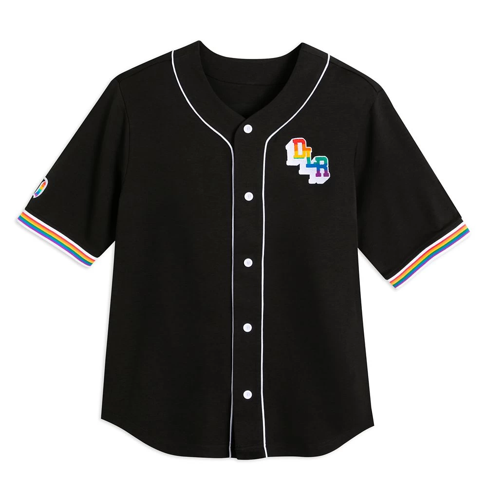 Disney Pride presents a sporting edge with this heavyweight knit athletic jersey featuring embroidered Disneyland logo and Fantasyland Castle appliqué on back with ”DLR” lettering on chest and ”D” icon on sleeve, all plussed by rainbow color accents. Full snap front, contrast piping trim and rainbow stripe ribbed cuffs make you a winner in any arena.