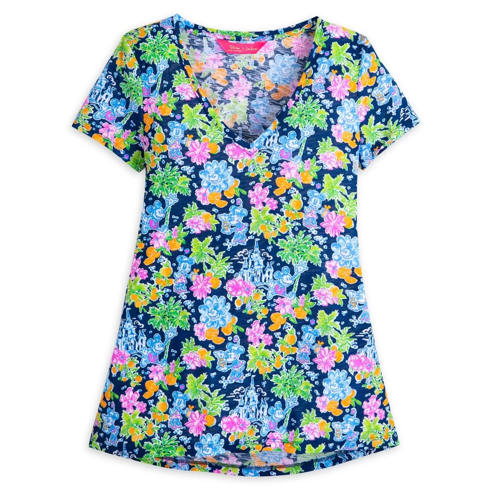 An exuberant print of Mickey and Minnie, tropical flowers, Fantasyland Castle and sweet, colorful oranges can mean only one thing… ”Lilly Loves Disney.” This Etta V-neck cotton tee by Lilly Pulitzer, with its flattering, vacation-ready fit, embodies the joy of the perfect day at the Disney Parks and beyond.